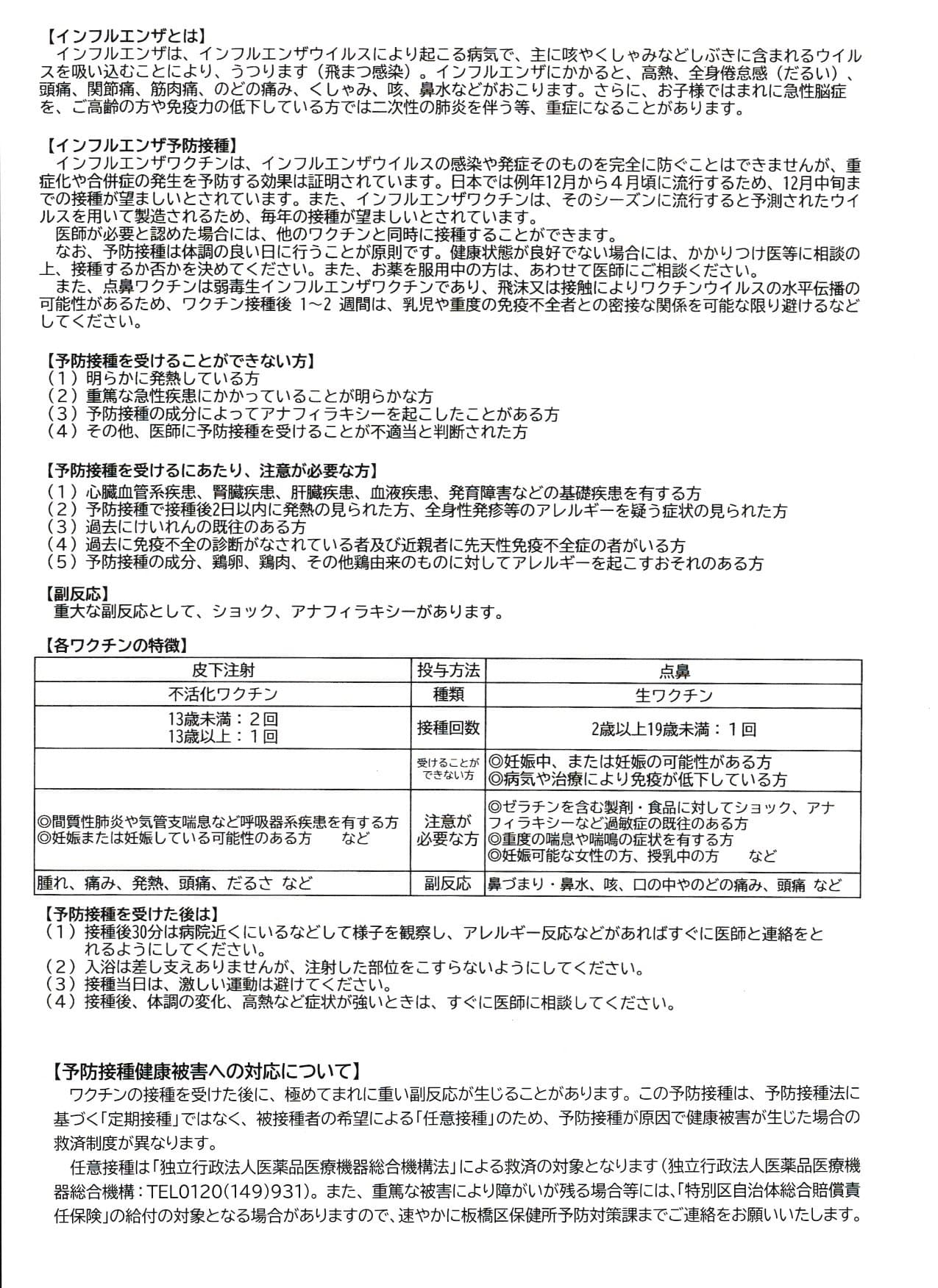 今までお子さんのワクチンのみ対応しておりましたが、今年はお子さんを同伴された親御さんのインフルエンザワクチン接種も対応できる余力ができましたので、ご希望がありましたらご利用ください。